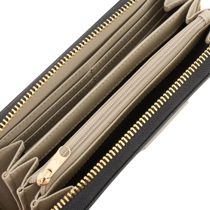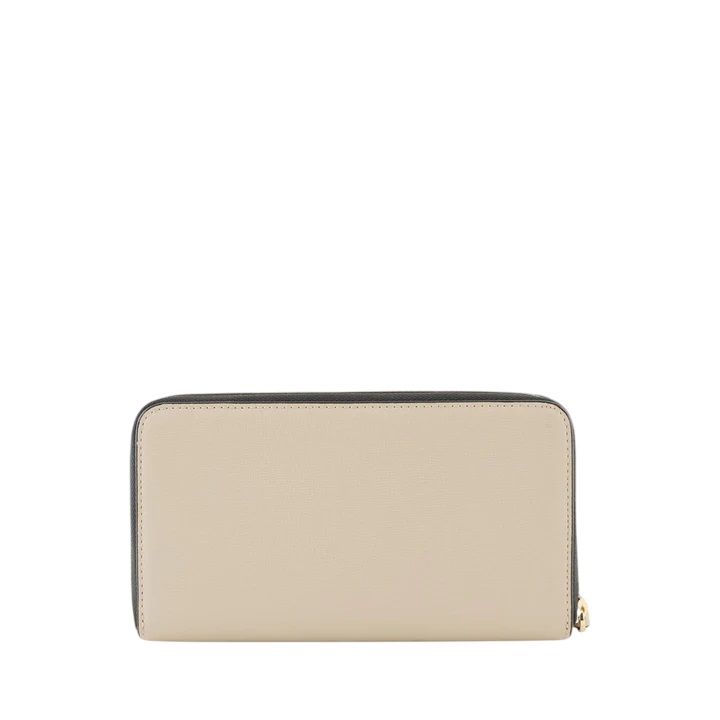 Portafoglio di forma orizzontale realizzato in materiale resistente caratterizzato dalla decorazione con maxi logo applicato. Il portafoglio presenta chiusura con bottone a pressione, tasche interne per carte e scomparto per banconote.