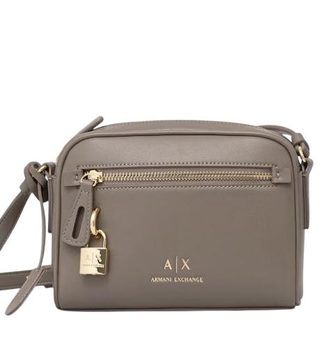 Borsa a tracolla Armani Exchange in ecopelle nera liscia, dal design compatto e moderno, impreziosita da dettagli metallici dorati e dal caratteristico lucchetto con logo A|X frontale.