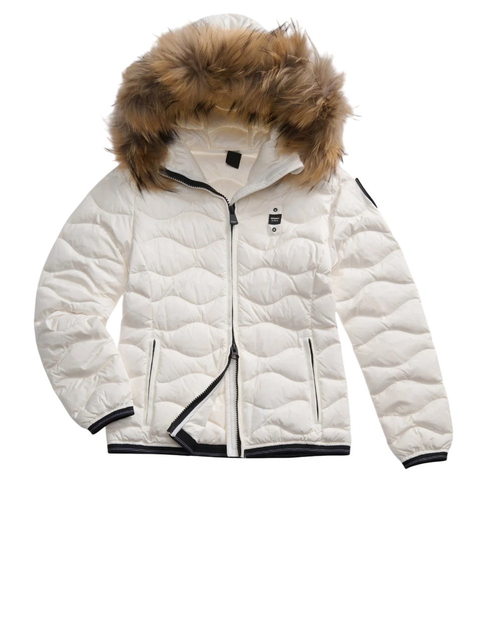 Piumino idrorepellente trapuntato ad onde orizzontali e con profilo del cappuccio in vera piuma. Capo iconico Blauer con imbottitura naturale, calda e non ingombrante, per essere sempre alla moda.