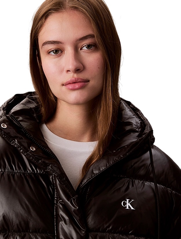 Con una finitura lucida ed elegante, questo piumino con cappuccio assicura stile ed eleganza anche nelle giornate fredde.