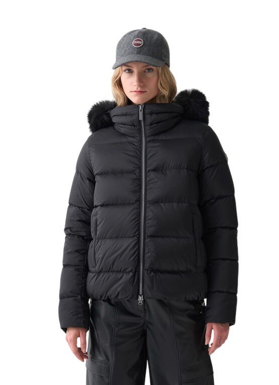 Giacca da donna con cappuccio staccabile realizzata in tessuto 100% riciclato con effetto cangiante e trattamento idrorepellente. Imbottita in piuma naturale. Calore e confort assicurati dal collo importante con trapuntature più fitte e dal cappuccio avvolgente legato al collo da una zip. Una pratica coulisse di regolazione permette di variare l'ampiezza del fondo. Versatile e caldo è perfetto per affrontare le fredde giornate invernali.