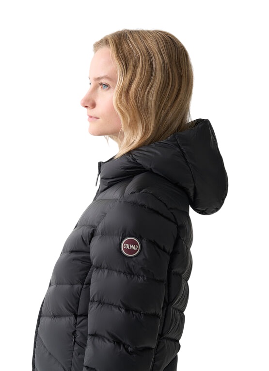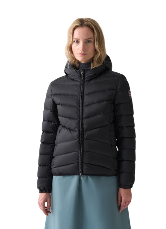 Piumino da donna firmato Duno, leggero e caldo, realizzato in tessuto tecnico trapuntato con imbottitura ad alta termicità. Il modello è caratterizzato da una vestibilità asciutta, chiusura full zip a doppio cursore, cappuccio fisso e logo applicato sulla manica sinistra. La tonalità blu navy lo rende estremamente versatile e adatto sia a look sportivi che urbani.