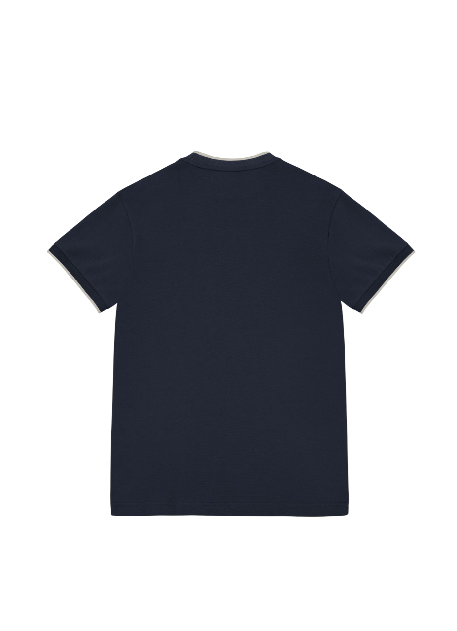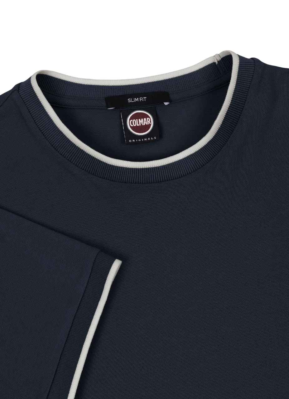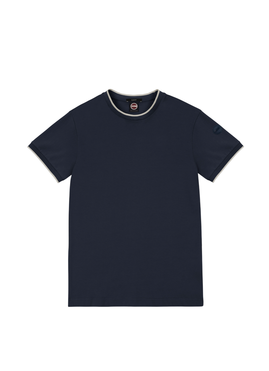 Maglietta da uomo girocollo a manica corta, realizzata in morbido piqué di cotone elasticizzato. Caratteristico collo e giromanica con riga in contrasto colore.