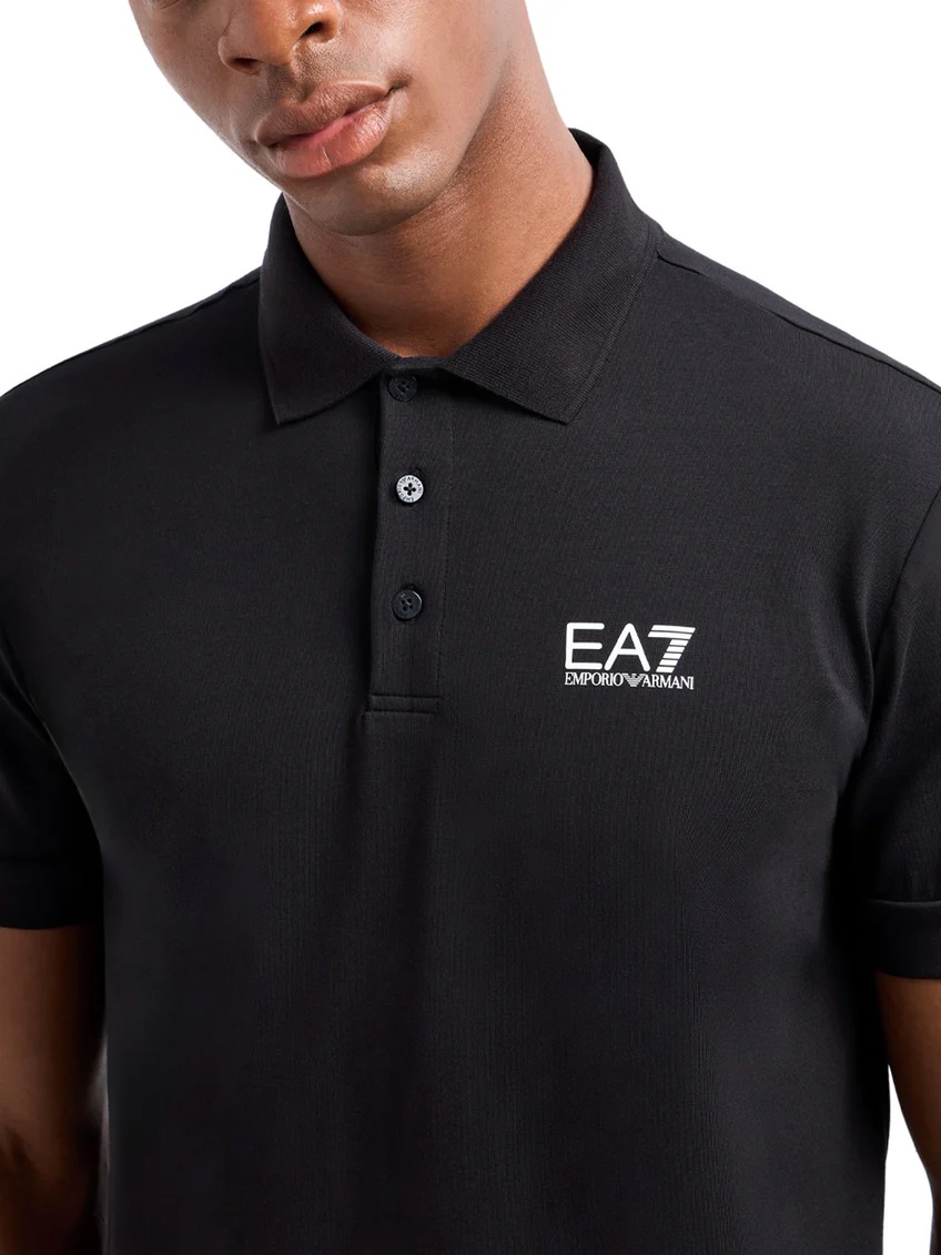 Il modello ha collo classico con bottoni, logo EA7 stampato a contrasto sul petto e maniche corte.