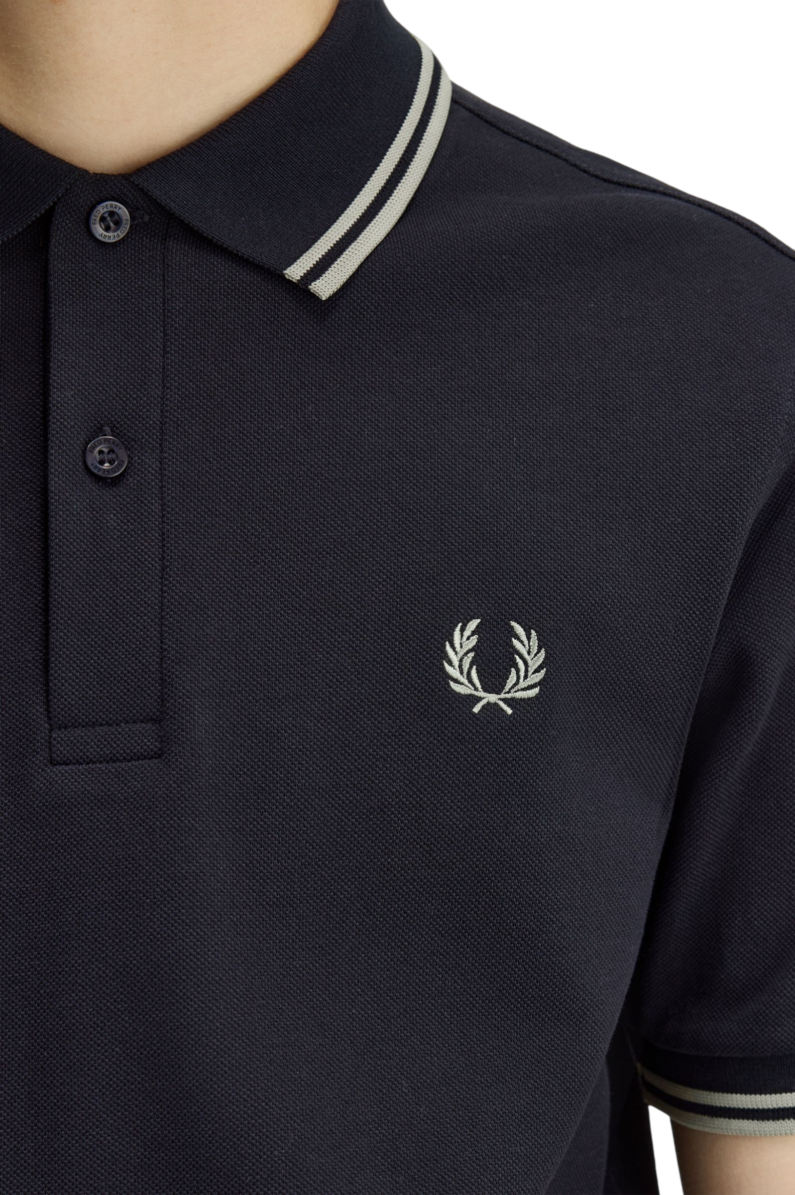 Piqué di cotone / Vestibilità regular / Pattina a due bottoni / Doppia riga su colletto e bordo manica / Corona d'alloro ricamata sul petto
