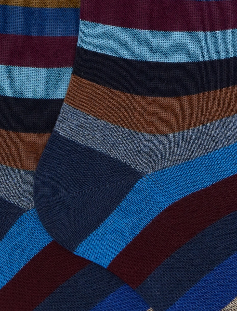 Calze lunghe da uomo in cotone, realizzate in Italia. Incredibilmente morbide al tatto, create per una persona dinamica che non rinuncia ad un dettaglio di stile. La fantasia a righe pari nei toni del blu le rende originali ma riconoscibili. Adatte ad un look formale o stravagante. La scritta Gallo è in punta a contrasto.