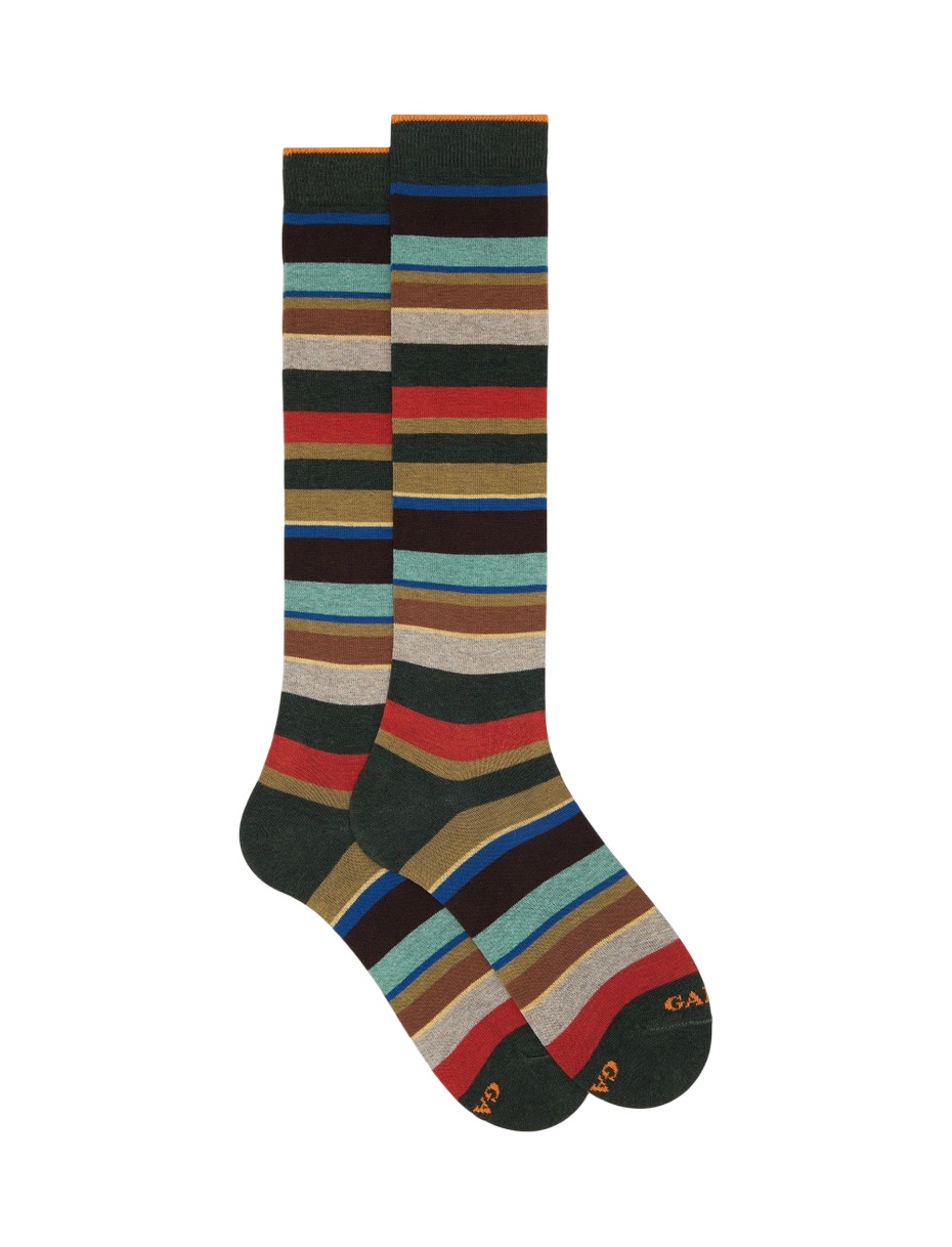 Calze lunghe da uomo realizzate in Italia in cotone elasticizzato, morbidissime al tatto e create per adattarsi perfettamente ad ogni tipo di look. L'iconica fantasia a righe multicolor sui toni del verde rende queste calze immediatamente riconoscibili. Il brand Gallo è ricamato in punta a contrasto.
