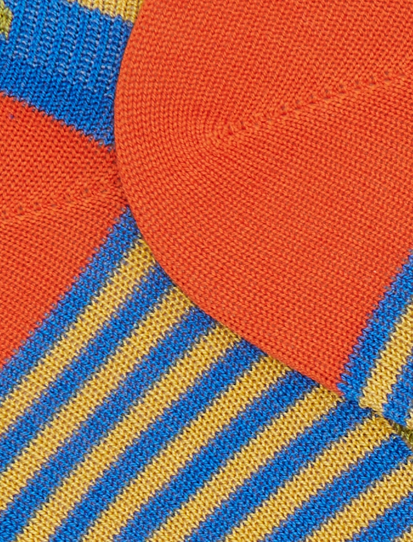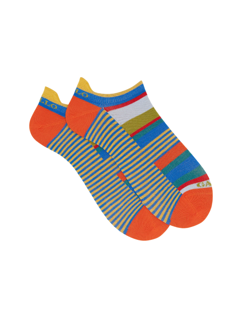 Calze da uomo modello sneakers realizzate in Italia in morbido cotone leggero elasticizzato. I colori vivaci delle righe multicolor e windsor, a base blu rendono questo accessorio un vero dettaglio di stile da abbinare ai look più stravaganti.