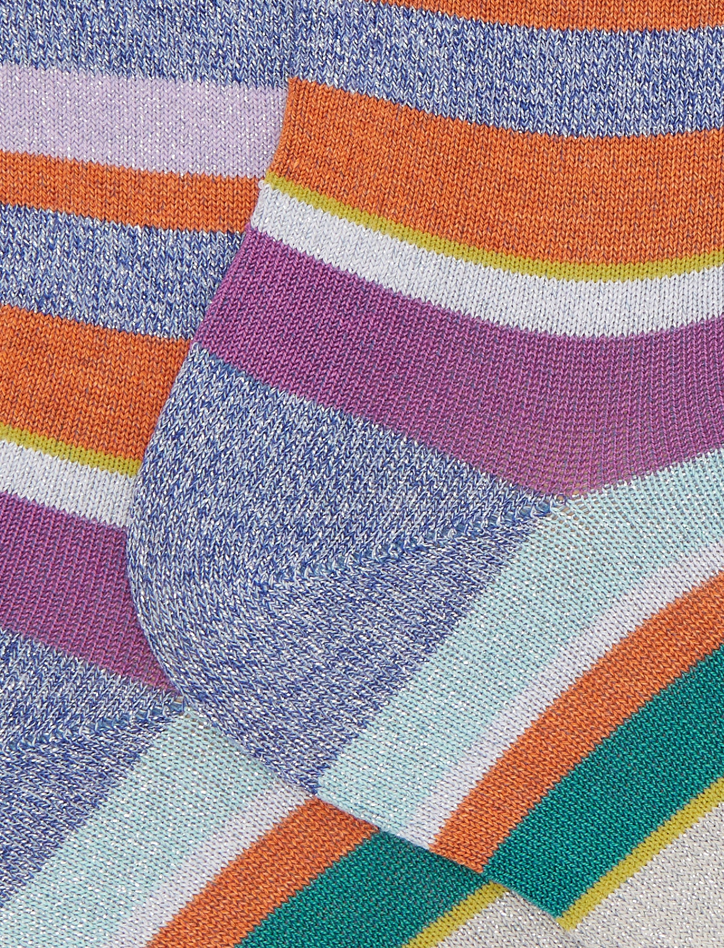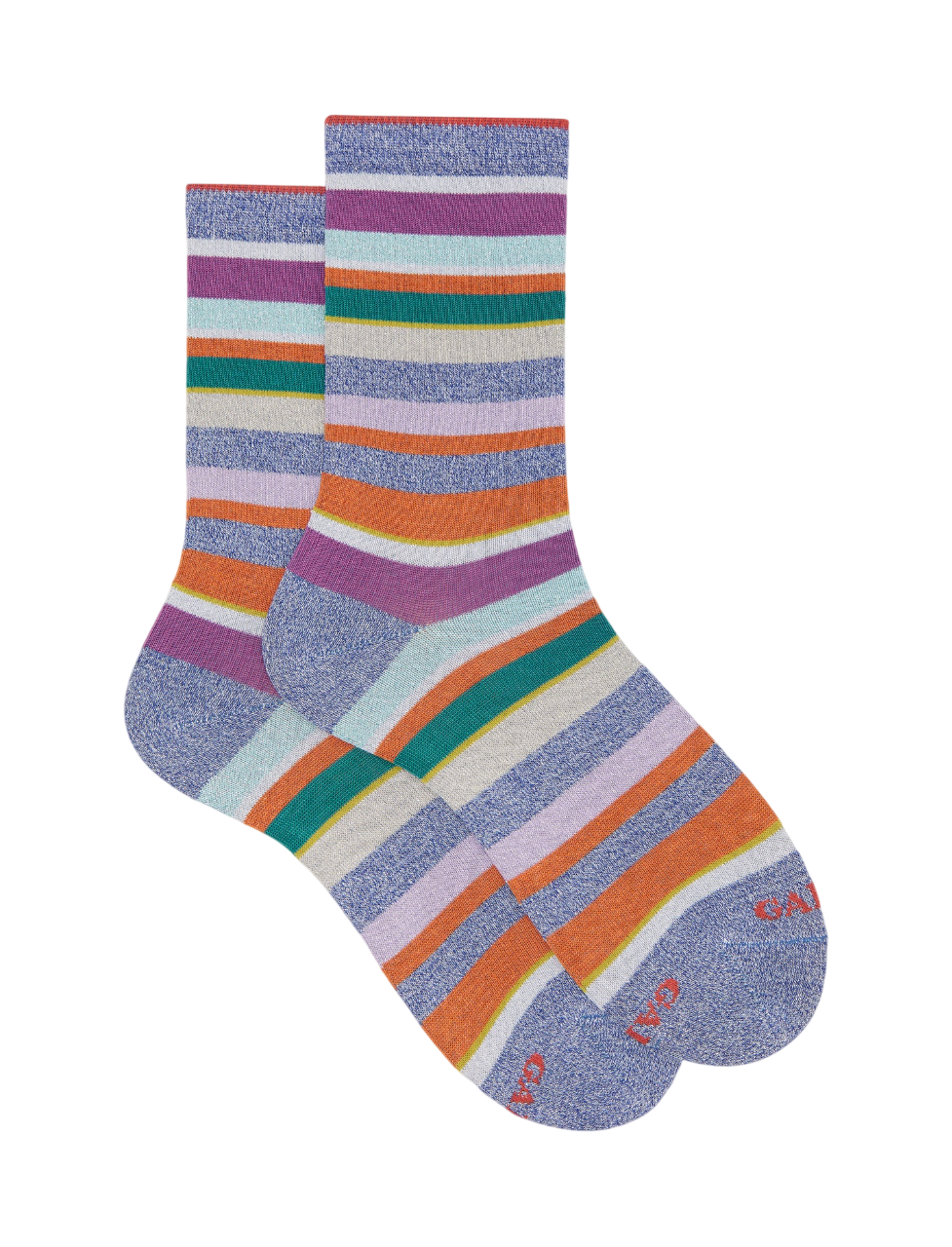 Calze corte da donna realizzate in Italia con un blend di filati. Molto morbide al tatto, create per una persona dinamica che non rinuncia ad un dettaglio di stile. L'iconica fantasia a righe multicolor nei toni dell'azzurro le rende originali ma riconoscibili. Adatte ad un look formale o stravagante.