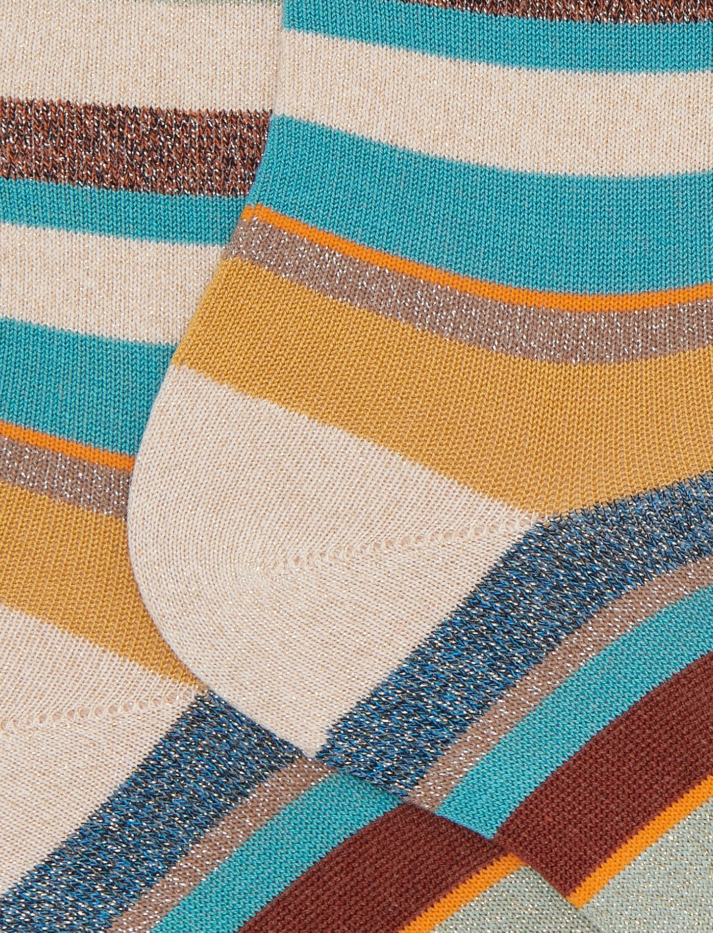 Calze corte da donna realizzate in Italia con un blend di filati. Molto morbide al tatto, create per una persona dinamica che non rinuncia ad un dettaglio di stile. L'iconica fantasia a righe multicolor nei toni del beige le rende originali ma riconoscibili. Adatte ad un look formale o stravagante.