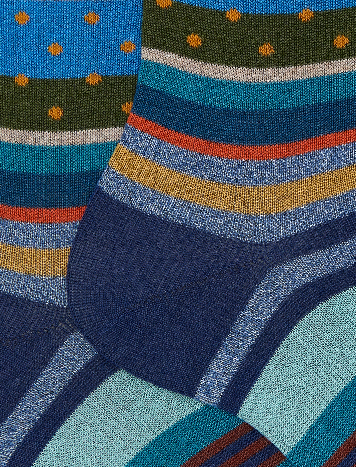 Calze corte da uomo realizzate in Italia in morbido cotone con un mix di righe e pois nei toni del blu. Perfette per aggiungere un tocco di originalità a ogni look.