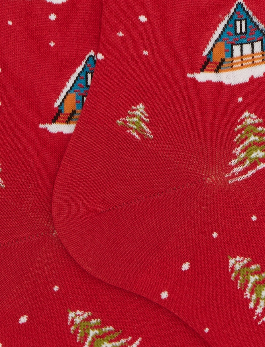 Calze lunghe da uomo in morbido cotone rosso, decorate con una suggestiva fantasia di baite innevate. Un modello caldo e originale, perfetto per le stagioni fredde. Un capo firmato Gallo, eccellenza italiana dal 1927.