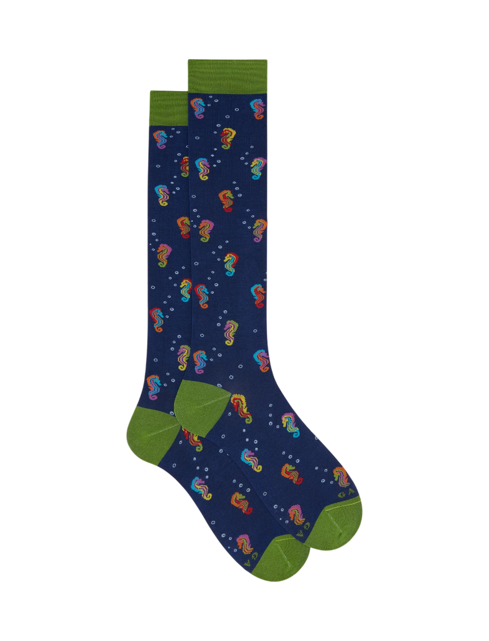 Calze lunghe da uomo in pregiato cotone, adornate da una raffinata fantasia blu con cavallucci marini colorati. La lavorazione artigianale esprime un equilibrio perfetto tra tradizione e innovazione, conferendo a ogni pezzo un carattere unico e distintivo. Il morbido intreccio dei materiali nobili garantisce comfort e una vestibilità impeccabile. Realizzate in Italia, sinonimo di qualità ed eccellenza GALLO.
