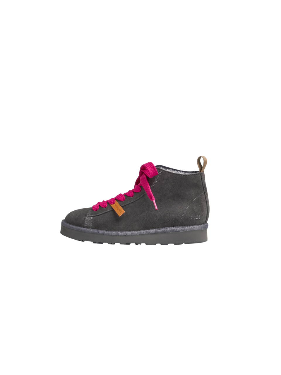 Polacchini donna P001 con tomaia di camoscio grigio antracite, lacci a trama larga fucsia e fodera interna di faux fur. La P001 con le sue linee pulite rappresenta il perfetto equilibrio fra design e comfort.