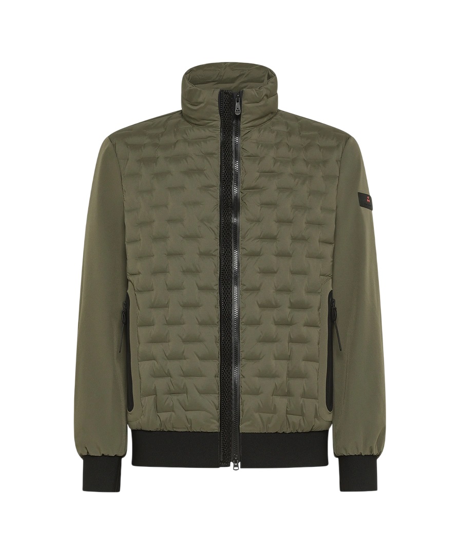 Bomber in doppio materiale: il tessuto primario è uno jacquard di poliestere stretch che, grazie a una speciale lavorazione di tintura, rivela contrasti di colore tra dritto e rovescio, per un effetto visivo unico e ricercato. Il tessuto secondario è un soft shell di nylon stretch accoppiato con un jersey di poliestere, soffice e caldo grazie alla finezza dei filati utilizzati. Parte dell’conica linea Transeasonal, una rappresentazione del concetto urban in cui comfort, praticità e stile si uniscono a uno studio approfondito dei materiali e dei pesi dando vita a capi versatili e adatti a ogni stagione. Il design è arricchito da una distintiva trapunta geometrica, maniche lisce e dettagli neri in contrasto e linee essenziali. La chiusura centrale con doppia zip che assicura comfort e praticità, le tasche laterali a filetto e il fondo e i polsini in tessuto nero rifiniscono il look. Imbottito in piuma naturale certificata, idrorepellente, è il capo ideale per chi cerca uno stile urbano moderno perfetto per affrontare la città con un tocco di carattere.