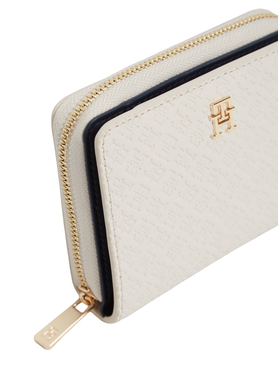 Il portafoglio compatto è arricchito dai monogrammi TH impressi all over e dalle scintillanti parti metalliche, per un raffinato effetto tattile.