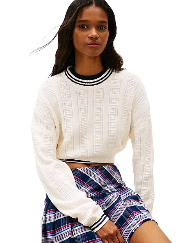 Il pullover relaxed fit, in maglia intrecciata con motivo di bandierine all over, aggiunge un tocco di stile heritage ai tuoi look.