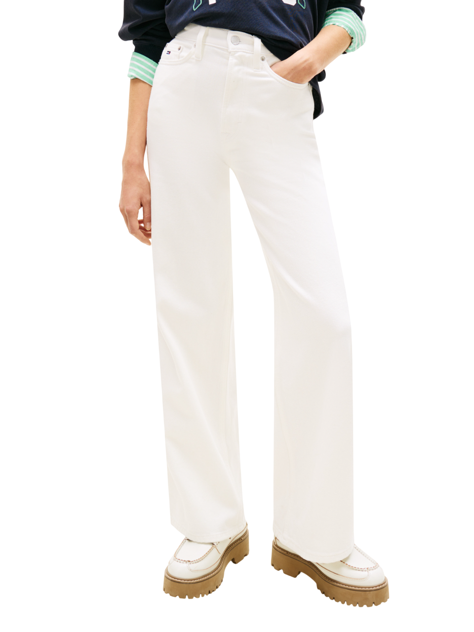 I classici jeans bianchi, caratterizzati dalla vita alta e dal taglio ampio, combinano il fascino rétro con dettagli moderni.