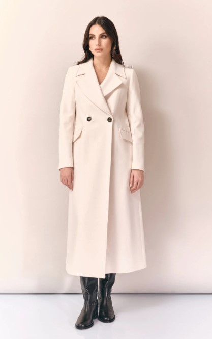 Cappotto lungo sfiancato, tinta unita, collo con revers, maniche lunghe, interno foderato, chiusura con bottoni.