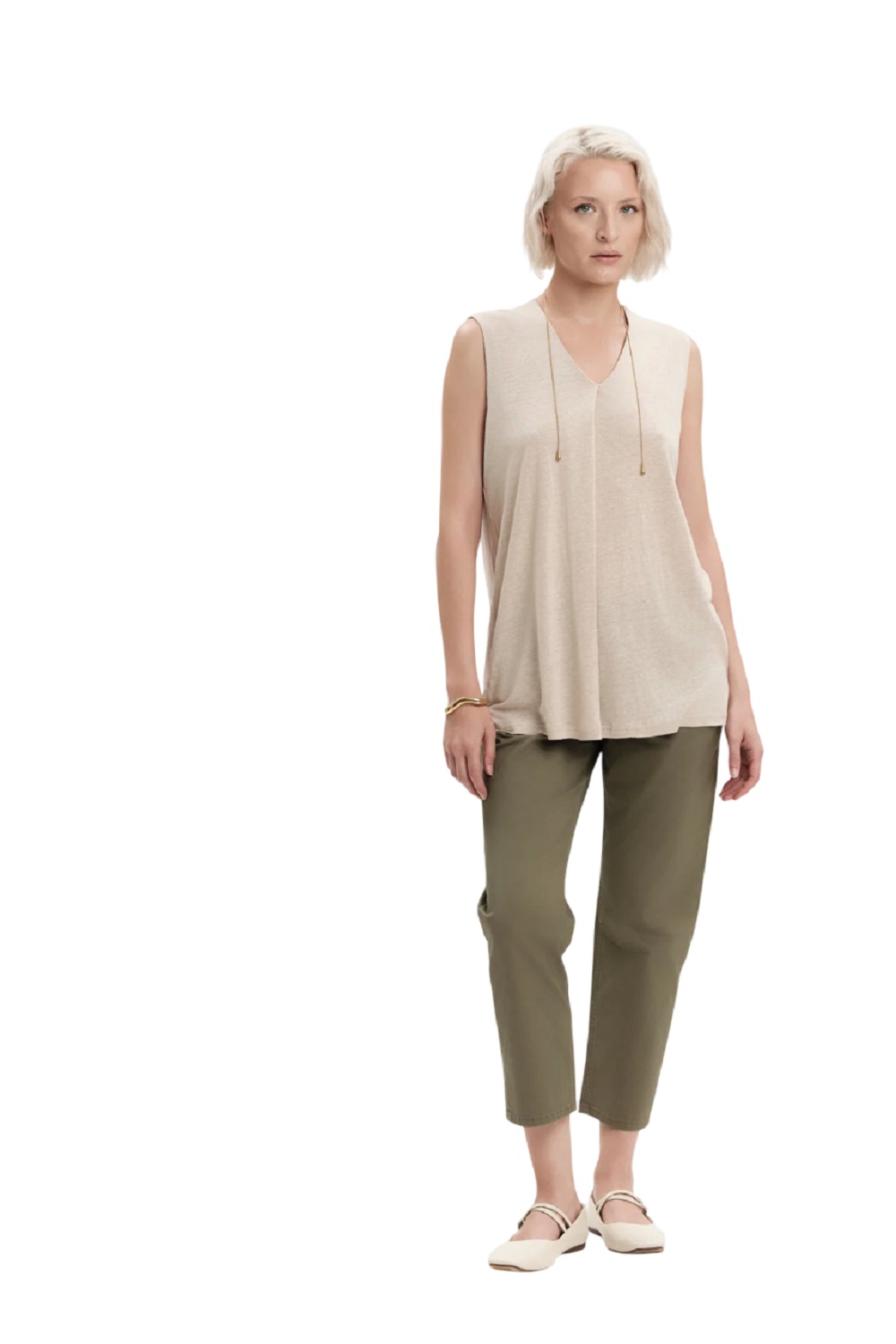 Top in misto lino lungo con piegone, spallina larga, scollo a v